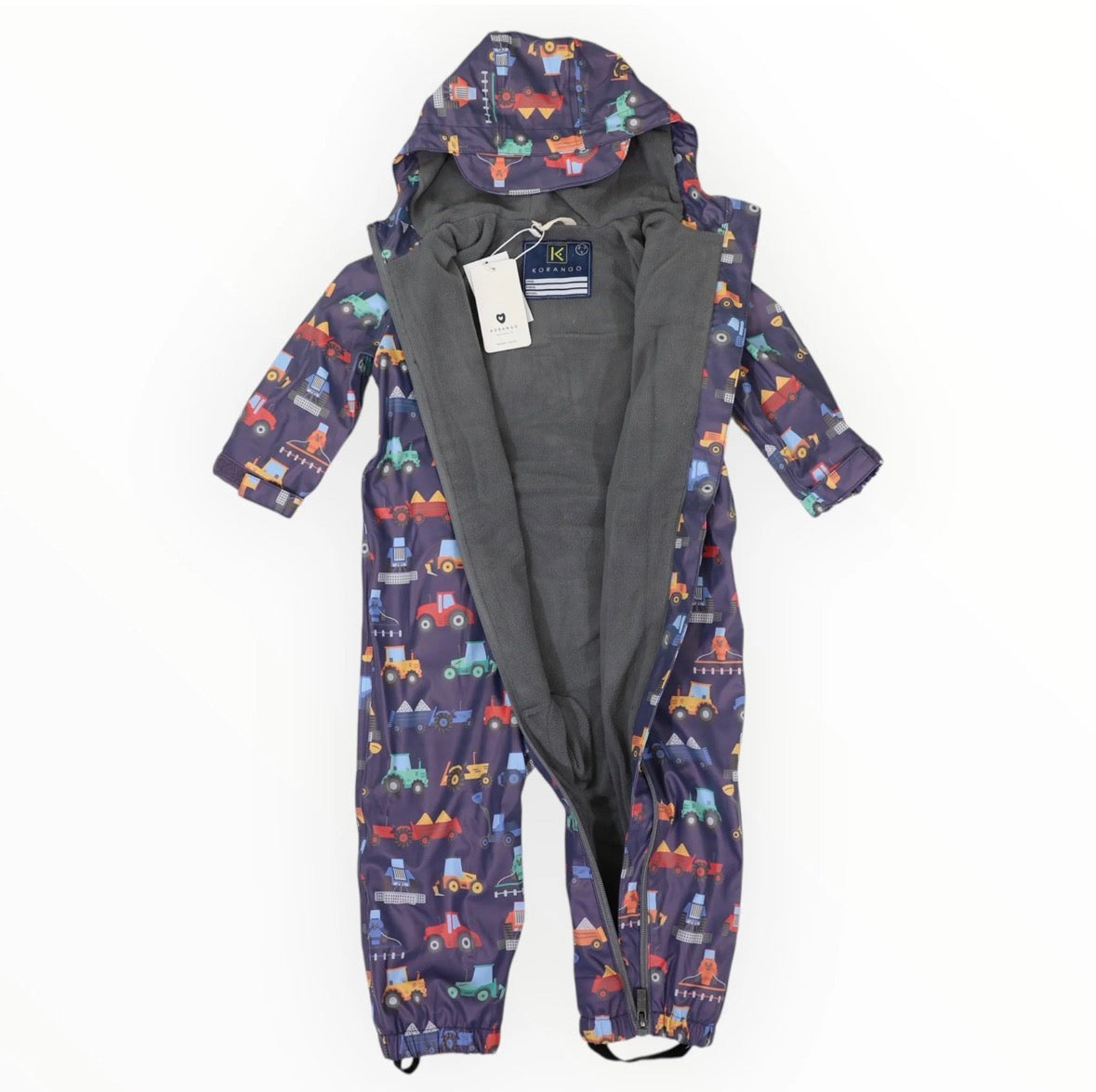 DESCRIPTION Keep your little adventurer warm and dry with Korango's Farm Machine Print Rainsuit in Navy. This playful rainsuit features a fun truck machinery print that kids love, plus a waterproof outer shell and cozy...