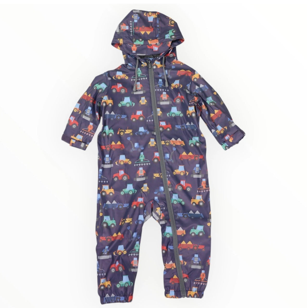Keep your little adventurer warm and dry with Korango's Farm Machine Print Rainsuit in Navy. This playful rainsuit features a fun truck machinery print that kids love, plus a waterproof outer shell and cozy fleece lining to handle whatever weather comes their way. The attached hood, easy YKK zipper, adjustable wrist velcro, elastic ankle cuffs, and foot straps ensure a snug, secure fit during every outdoor escapade. Perfect for splashing in puddles or exploring the backyard!